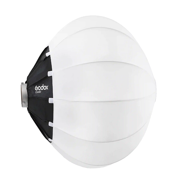 Godox CS-65D 是一款直徑約 65 公分的燈籠型懸吊式柔光罩(Lantern Softbox),採用 Bowens 卡口設計,可快速開合,非常適合影片拍攝、直播或室內柔化環境光源。光線分佈接近全方位(270°),可做為主光或環境填光使用。因其體積與光擴散特性,能在不刺眼的情況下提供均勻柔和的照明效果。